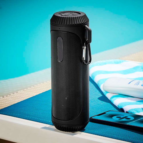 Bocina bluetooth con batería recargable. Reproducción de música 6 horas aproximadamente. Controles integrados de llamada, volumen y reproducción de audio. Entrada de tarjeta microSD y USB, modo radio FM. Función manos libres y linterna de un led. Mosquetón para transportar fácilmente. Incluye cable cargador USB.