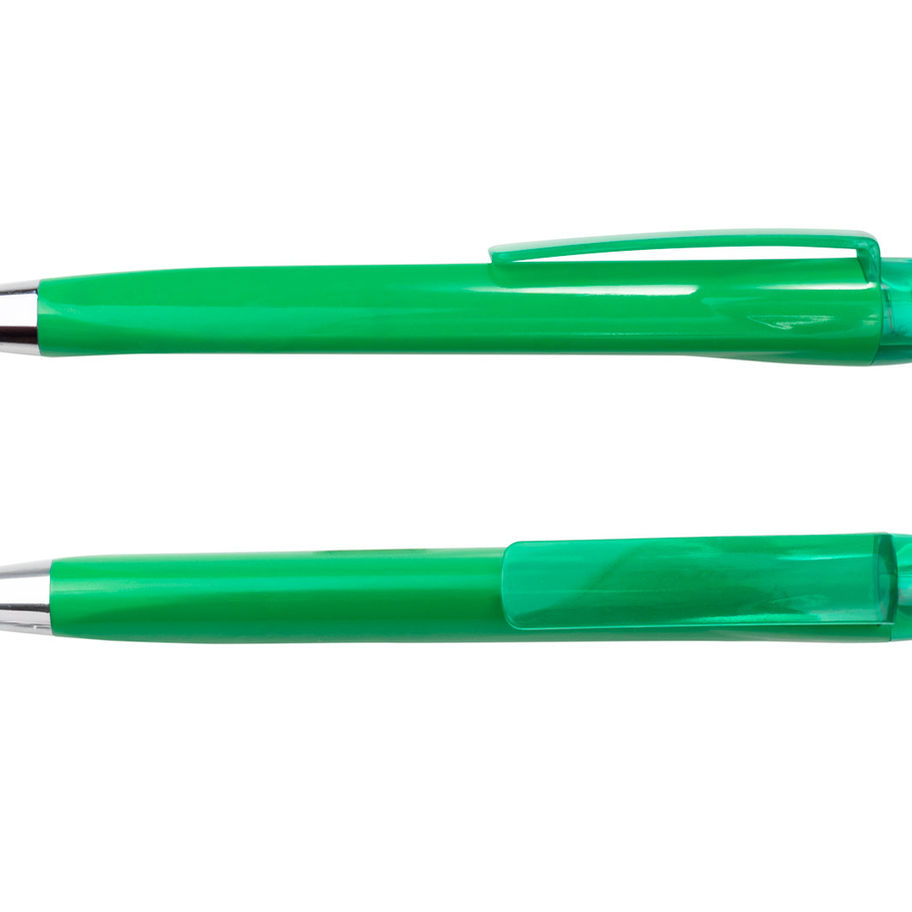 Bolígrafo con barril de color sólido, clip y empujador en acabado transparente, y punta cromada que aporta un toque moderno al diseño. Su estructura liviana y funcional lo hace ideal para uso diario en distintos entornos.