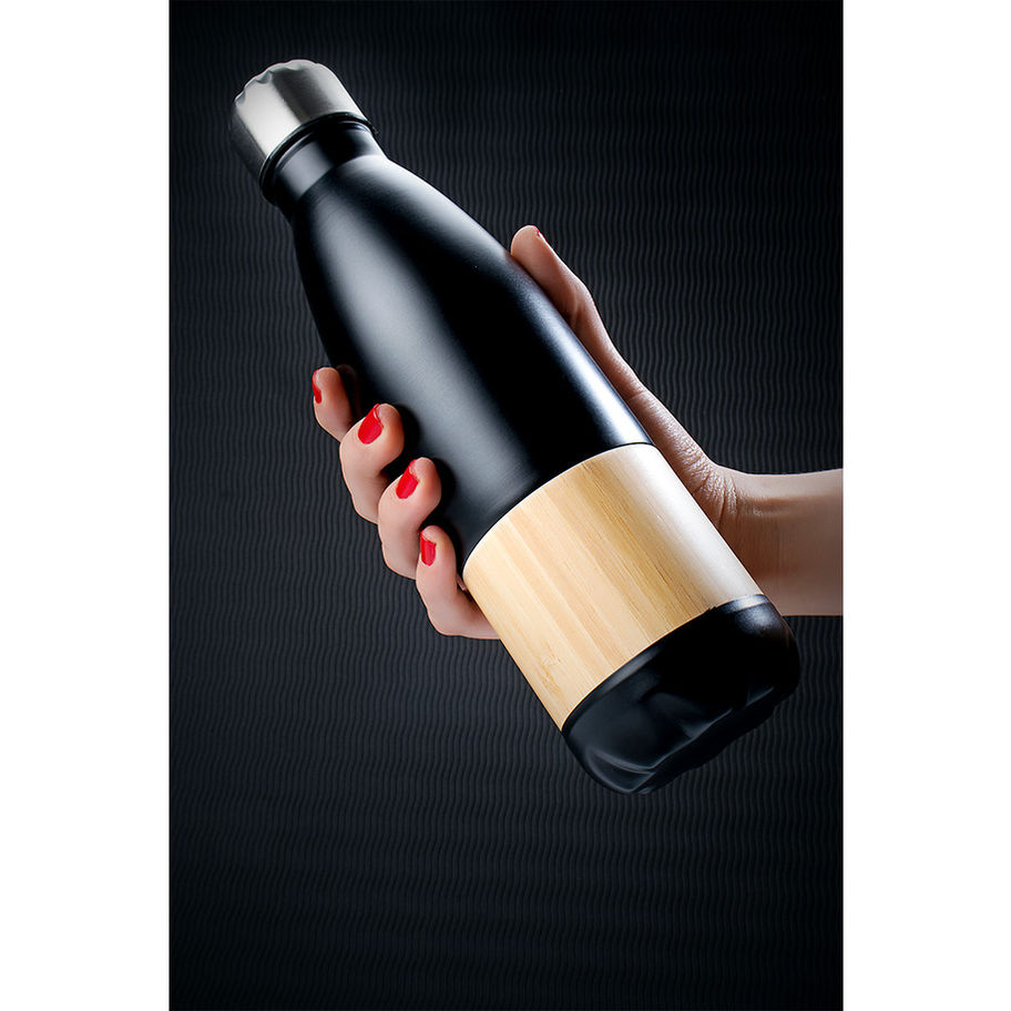 Botella en acero con aplique en la parte exterior en bambú y tapa rosca. Capacidad de 500 ml / 17 Oz.