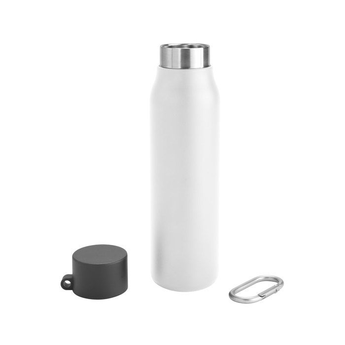 Botella doble pared, sellada al vacío. Interior en acero 304 reciclado y exterior en acero 201. Pintura powder coat (pintura más duradera y resistente a la corrosión y el paso del tiempo). Tapa plástica de polipropileno y anillo de silicona con mosquetón de aluminio. Mantiene hasta 12 hs la temperatura de las bebidas calientes y 24 hs de las bebidas frías.