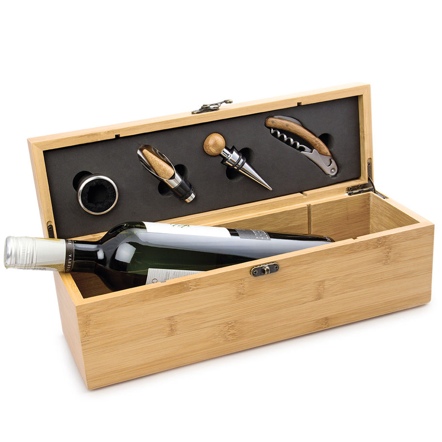 Contiene: 4 accesorios de bar con aplique en madera: Sacacorchos descapsulador de 1 tiempo, cortagotas, tapón metálico y aro antigoteo. NO INCLUYE LA BOTELLA DE VINO.