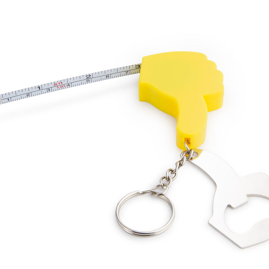 Llavero con destapador en forma de mano. Cinta métrica metálica de 1 metro/39 pulgadas.