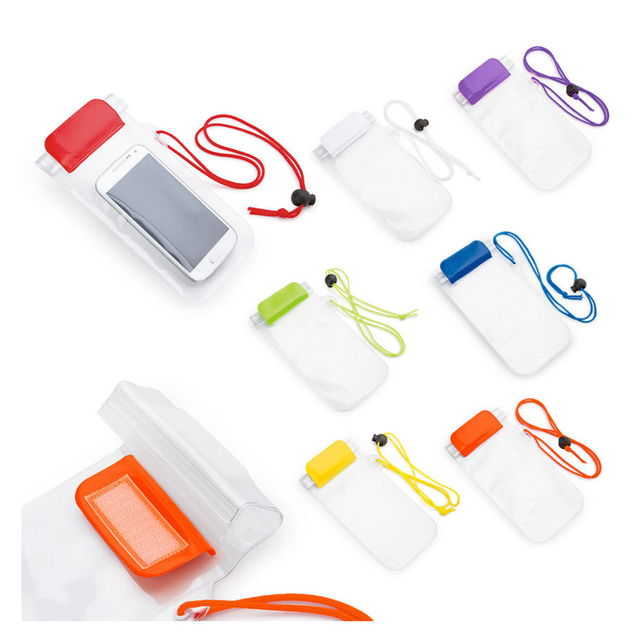 Estuche impermeable para celular o documentos. Ideal para cualquier actividad al aire libre. Cordón ajustable y cierre en velcro.