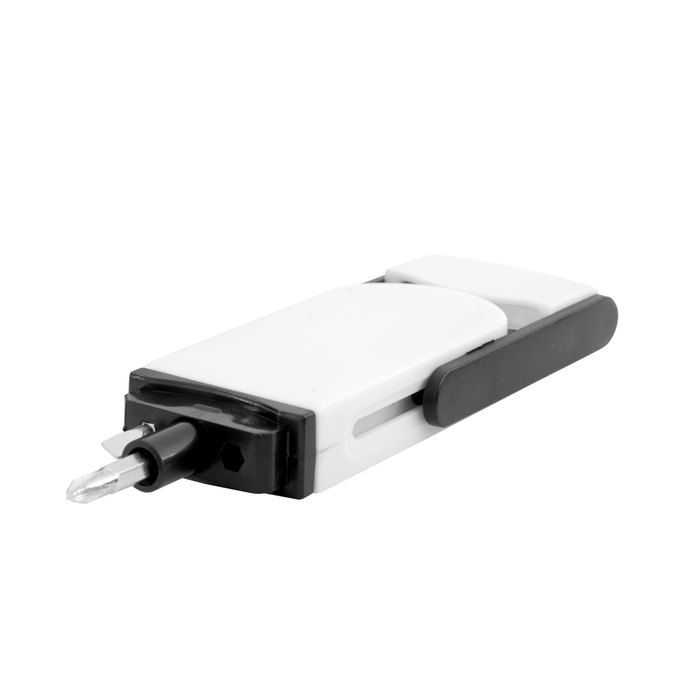 Set de destornillador con 2 puntas intercambiables ocultas (plana de 3,5 mm y phillips de 2mm.) Ambas en CR-V que las hace más durables y resistentes a la corrosión. Incluye cinta métrica de 1 m. con escalas en centímetros, pulgadas y pies. Cuerpo imantado para poder fijar las puntas. Apertura por deslizamiento.