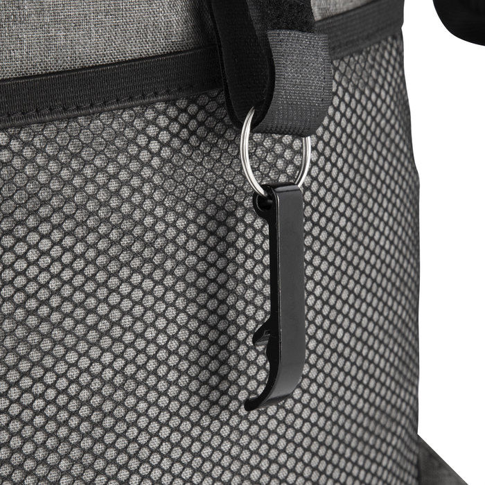 Morral cooler. Compartimento principal con cierre en la parte superior. Compartimento frontal con cierre. Dos bolsillos laterales de red multipropósito. Incluye llavero destapador de botellas de aluminio (5,5 x 1,1 cm) extraíble. Correas regulables acolchadas y reforzadas. Cierres metálicos. Tiradores de cierre metálicos de color negro.