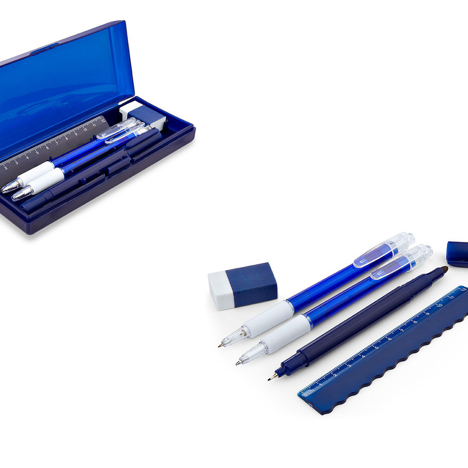 Set de escritorio en estuche plástico, contiene: resaltador, bolígrafo, portaminas, regla y borrador.