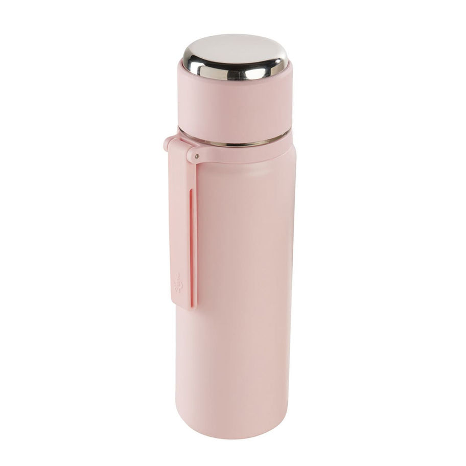 Termo doble pared. Cerrado al vacio. Pared interna y externa acero inoxidable. Tapa de plastico con sistema de rosca, boquilla y boton de seguridad para mantener cerrado y sin derrames, incluye sobretapa metalica de rosca. Cuenta con un asa de silicon para llevarlo facilmente a donde quiera que vayas. Mantiene la temperatura caliente por 12 hrs y la temperatura fria por 24 hrs. Capacidad de 17 Oz. Incluye caja individual.