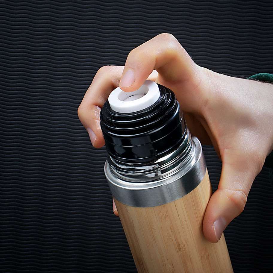 ermo en acero inoxidable con enchapado exterior en Bambú, Tapa rosca, la tapa se puede utilizar para tomar las bebidas, incluye filtro delgado.