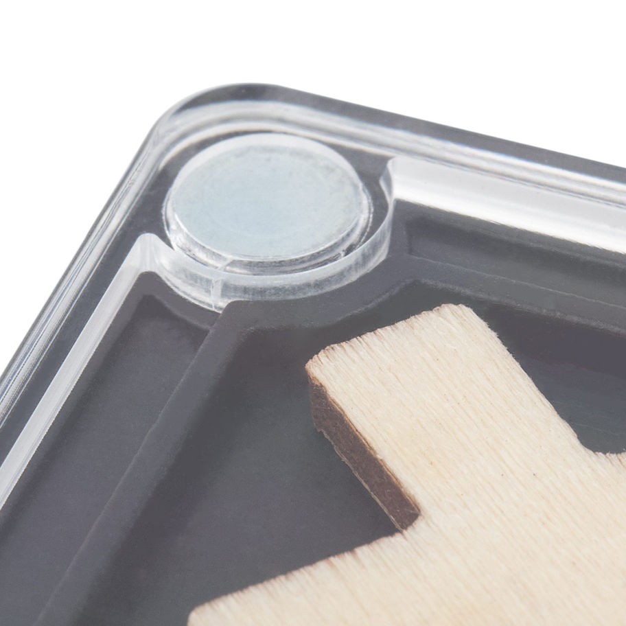 Portavasos de plástico con esquinas imantadas que permiten fijarlo a superficies metálicas; en su interior incluye un juego de triqui de madera con piezas con forma de “X” y “O” (2,2 X 2,2), ideal como accesorio decorativo y funcional para escritorio o espacios de entretenimiento.